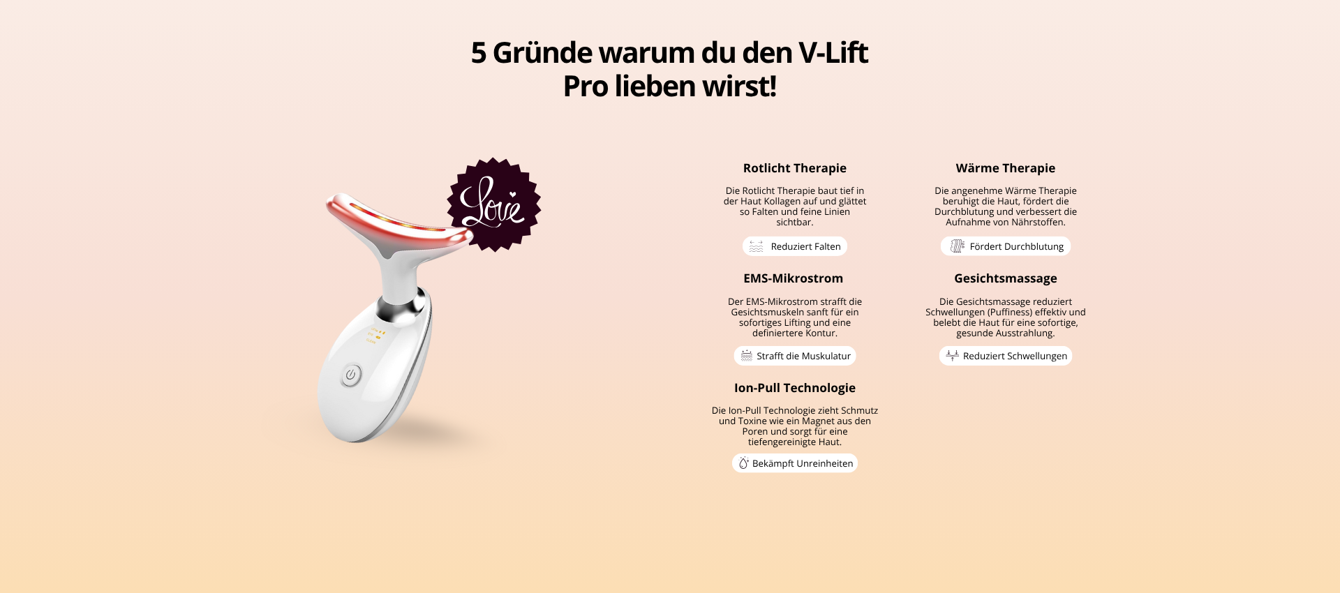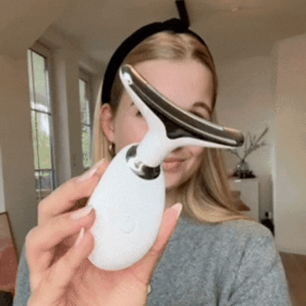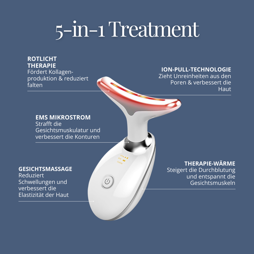Er ist das einzige Gerät, das Rotes LED-Licht, EMS-Mikroströme, Wärmetherapie, Ion Pull Technologie und Gesichtsmassage kombiniert.